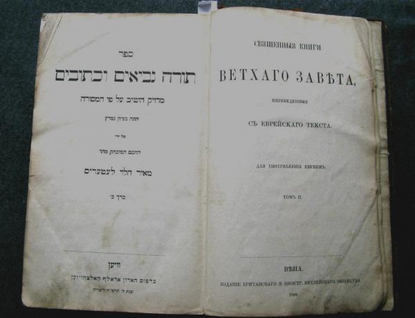 Раритет. Редкое издание Ветхий Завет, т.2. переведен с Еврейского текста, для употребления евреям, г/и 1888, г. Вена. Издание Британского и иностранного Библейского общества. Книга на двух языках - параллельный текст на иврите и русском. Текст практически не известен в России. Перевод Ветхого Завета осуществлен исключительно с еврейского оригинала, без вставок по Септуагинте или славянскому тексту, равным образом в нем не отразилась и семантика славянского текста. Отдельными частями он публиковался в Лондоне в 1866-1874 гг. иждивением Британского Библейского общества в объеме 1 Царств - Малахия, а в 1874 г. выпущен в обращение как второй том Библии (первым, вероятно, считался перевод Русского Библейского общества в объеме Восьмикнижия). В 1888 г. в Вене, Британское библейское общество опубликовало второй том Ветхого Завета, в нем была внесена редактура, направленная на устранение всякого влияния греческой или славянской версии как в объеме текста, так и в лексической семантике. Цельнокожаный переплет 19 века: картон в коже, с тиснением на обеих крышках, на корешке золотом, страницы все - 1384 целы, в отличном состоянии. Штампы, печати, рег.№, надписи - отсутствуют. Формат: 220*140*65 мм. т. 8 927 56116