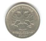 в центре диска — двуглавый орел с опущенными крыльями, над ним – надпись полукругом «БАНК РОССИИ», под ним – номинал «ОДИН РУБЛЬ», подчеркнутый горизонтальной линией, разделенной посередине точкой, внизу — «2001 г.», справа — товарный знак монетного двора.