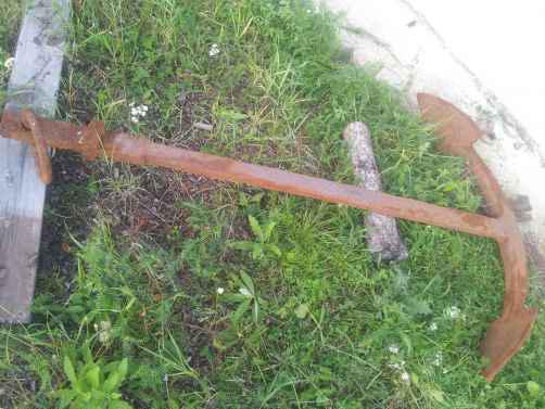 Описание: Старинный кованный адмиралтейский якорь, найден и поднят на ББКанале в 2015г.. От лапы до лапы расстояние 125 см., длина без рыма почти 2 метра (197 см).