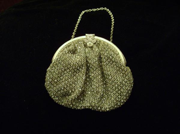 Описание: Сумочка театральная антикварная плетеная со стразами, на шелковой подкладке, с ажурной застежкой из белого металла с вкрапленными стразами, ручка в виде цепочки из того же металла. 20 век. Состояние хорошее.